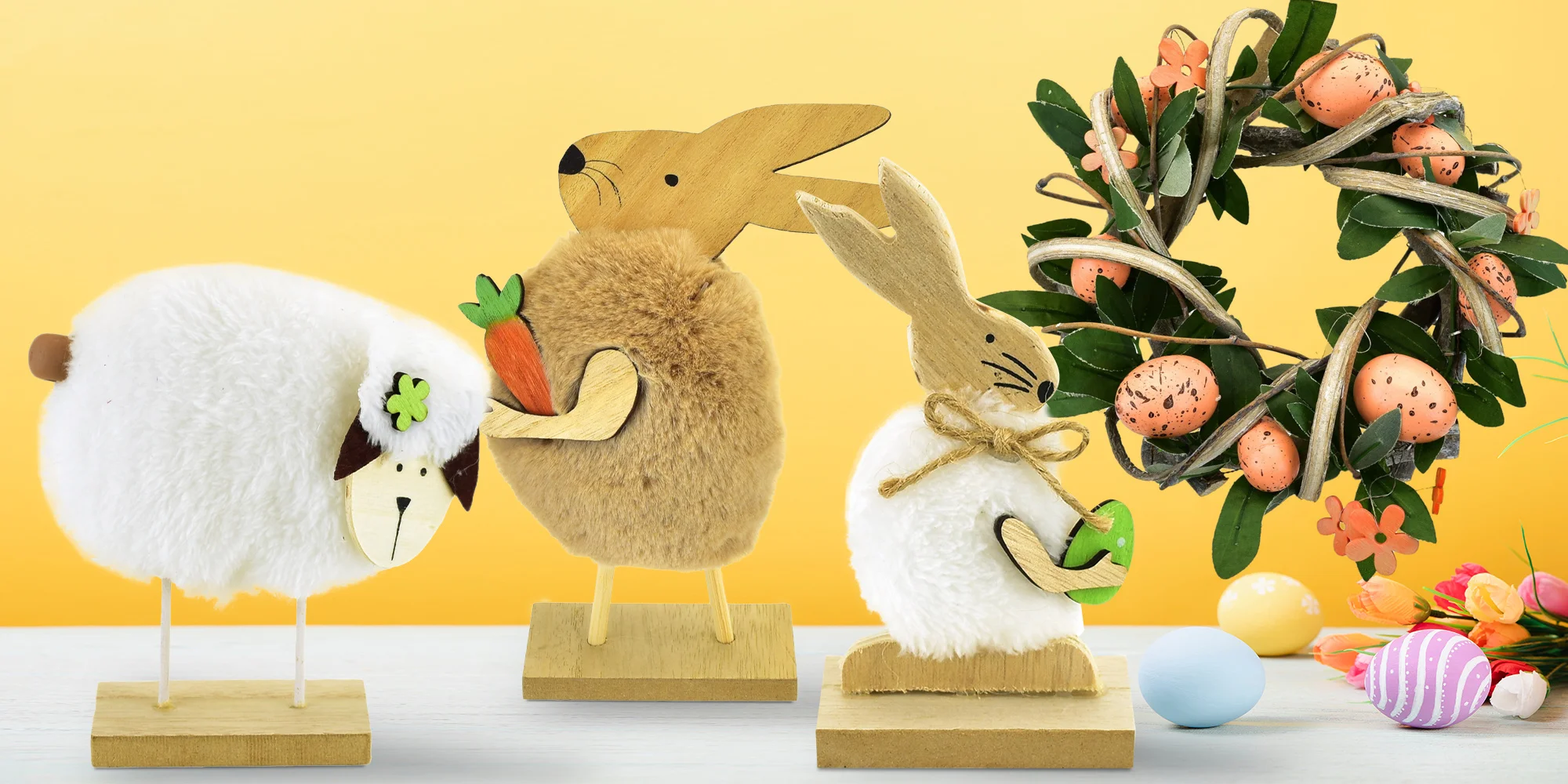 Vpusťte do bytu jaro a Velikonoce a s nimi i barvy. Nazdobte dveře, stůl a parapety veselými dekoracemi s motivy poslů jara – zajíčky, ovečkami i slepičkami. Zaručeně vám zlepší náladu! Vybrat si můžete decentní věnečky, něžné a křehké porcelánové figurky ve tvaru zajíčků, ptáčků či oveček a na stěnu zavěsit malovaná vajíčka. Dekorace jsou vyrobené převážně ze dřeva, keramiky, porcelánu a ratanu, udělají spoustu parády.