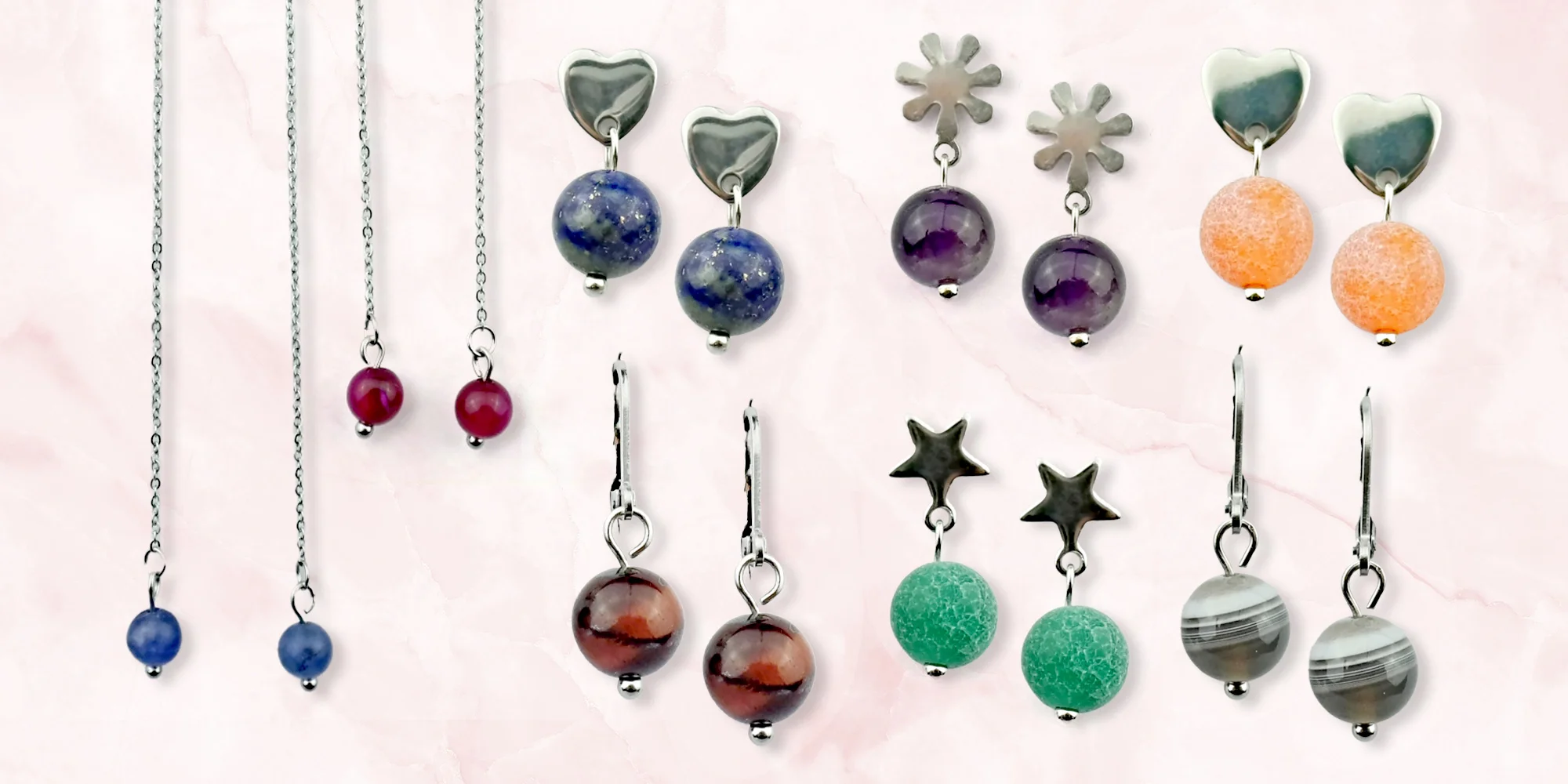 V nabídce najdete hned několik druhů. Tvoří je komponenty z nerezové antialergické oceli a opracované kameny ve tvaru kuličky o průměru 6 a 8 mm. Menší kameny jsou součástí visacích náušnic, ostatní náušnice zahrnují větší kameny. Náušnice jsou velmi lehké na nošení. Náušnice se zapínají na motýlky nebo patent (dle vybrané varianty).