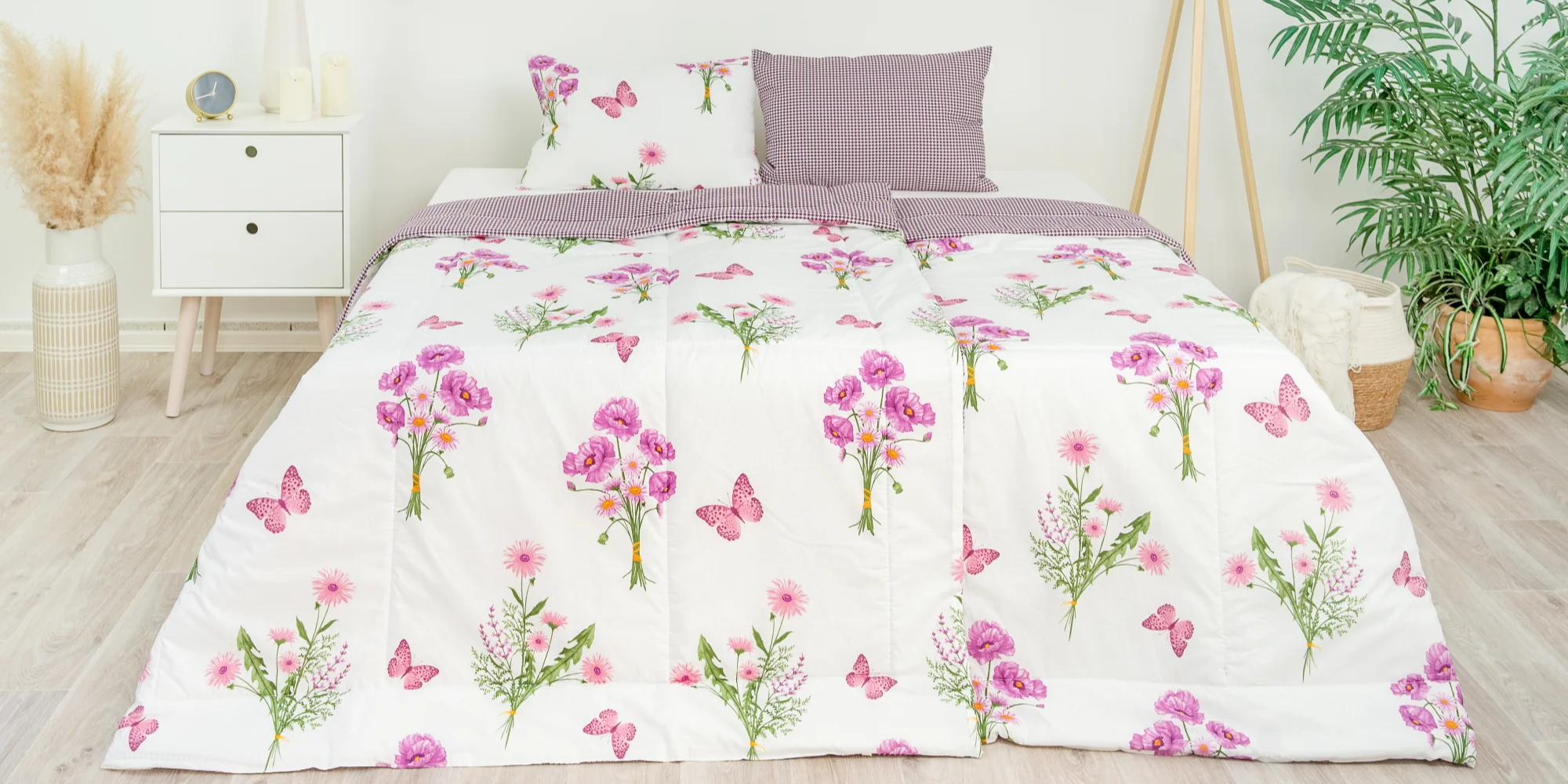 A snad k ještě většímu zdůraznění jejich přírodního původu jsou deky a polštáře vyzdobeny kytičkovým vzorem s oranžovými nebo fialovými květy a motýlky ve stejné barvě. Tak na co ještě čekáte? Vyhoďte staré deky z okna a zabalte se do nových.