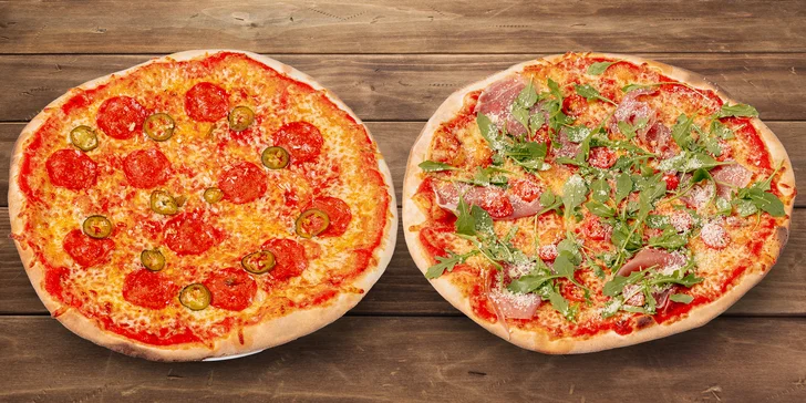 - Prosciutto e Rucola (tomatové sugo, mozzarella, prosciutto crudo, rukola, parmezán, cherry rajčátka)