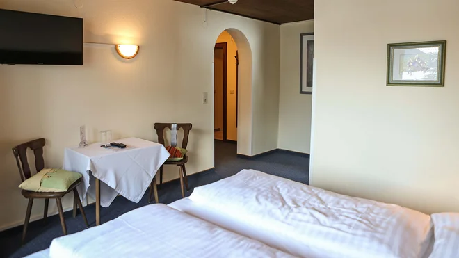 Připraven pro vás bude dvoulůžkový pokoj s pohodlnou manželskou postelí. Jeho součástí je také koupelna se sprchou a WC, fénem a ručníky. K dispozici je také připojení na Wi‑Fi a 32palcová HD TV s víc než 130 programy. Některé pokoje mají i balkon a krásný výhled na hory.