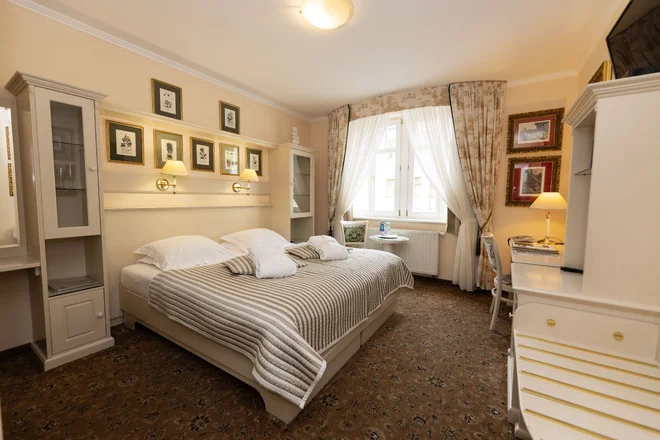 Zabydlíte se v pokoji dle výběru, v nabídce je dvoulůžkový pokoj, suite a suite s arkýřem. Interiéry jsou harmonicky doplněny dekorativními předměty a soškami, obrazy a květinovou výzdobou. Dvoulůžkové pokoje (21 až 23 m²) mají výhled na město a kostel sv. Máří Magdalény či do klidného dvora. Jsou vybaveny moderním pohodlným nábytkem v krémových barvách, LED TV, minibarem a Wi‑Fi. Nechybí koupelna s vanou, WC a kosmetikou.