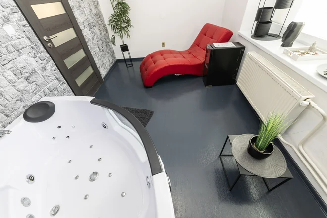 Zaručeně nejvíc času ale strávíte ve svém soukromém relaxačním centru – všechny vaše starosti se rozpustí v blahodárné bublinkové lázni, kterou si dopřejete ve vířivé masážní vaně. Pro ještě lepší zážitek si ve vířivce můžete vychutnat skleničku výběrového vína z vinotéky, kterou máte za poplatek k dispozici.