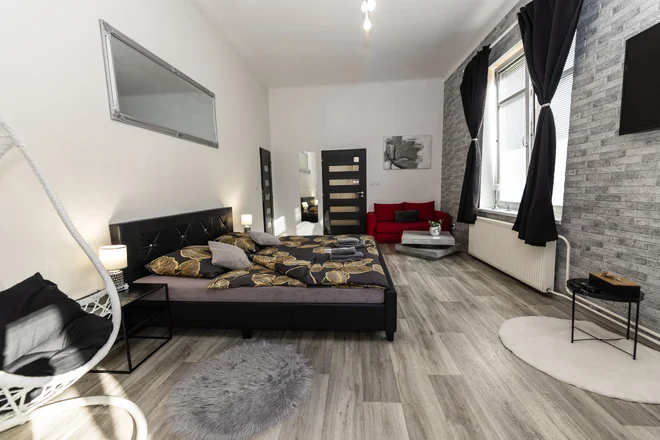 Jakmile vejdete dovnitř, už nebudete chtít odejít. Prostorný apartmán je zařízen v moderním stylu a najdete v něm vše potřebné pro dokonalou relaxační dovolenou. Hlavní obytná část spojuje ložnici s obývacím pokojem. Dorůžova se vyspíte na pohodlné manželské posteli, k dispozici máte také rozkládací pohovku, křeslo a televizi.