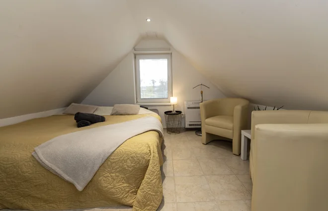 Na pohodovou dovolenou se můžete vypravit klidně jenom ve dvou, nebo vezměte celou partu. Ve dvoupatrovém apartmánu se pohodlně vyspí až 6 hostů. Jeho přízemí tvoří obývací pokoj s televizí a rozkládací pohovkou a samostatná koupelna se sprchovým koutem a toaletou.