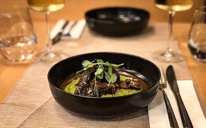 - 2× vepřové líčka se shitake, silnou omáčkou a pyré z hrášku