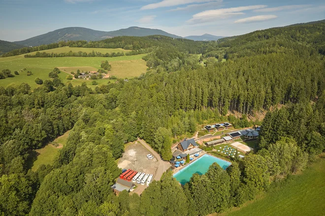Krásný resort u lesní plovárny v Mladých Bukách na úpatí Krkonoš: koupání, turistika i lyžování na dosah