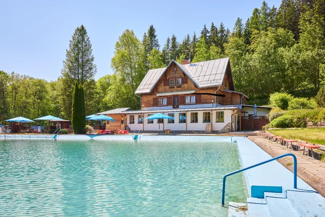 Krásný resort u lesní plovárny v Mladých Bukách na úpatí Krkonoš: koupání, turistika i lyžování na dosah