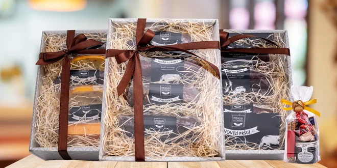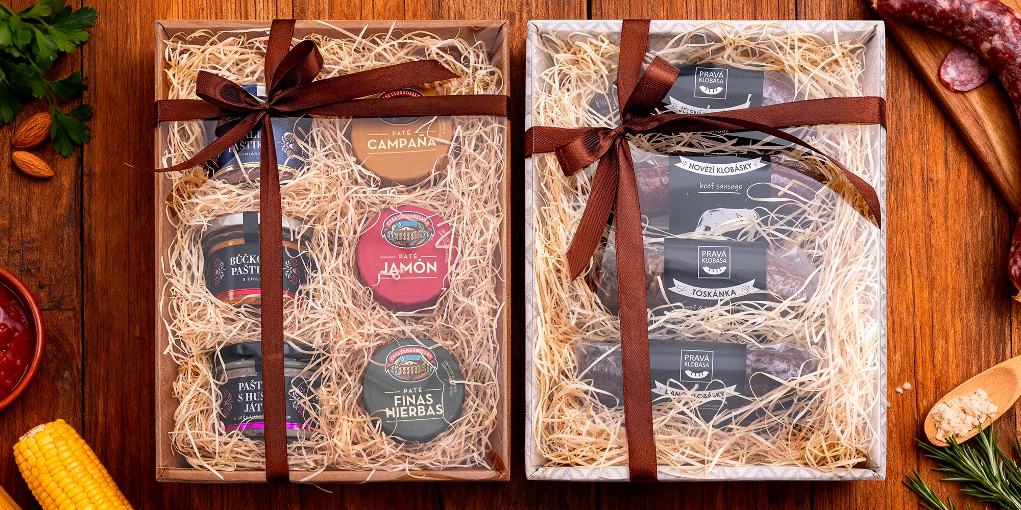 Dárkové balíčky plné delikates: víno, klobásy, paštiky i sladké dobroty