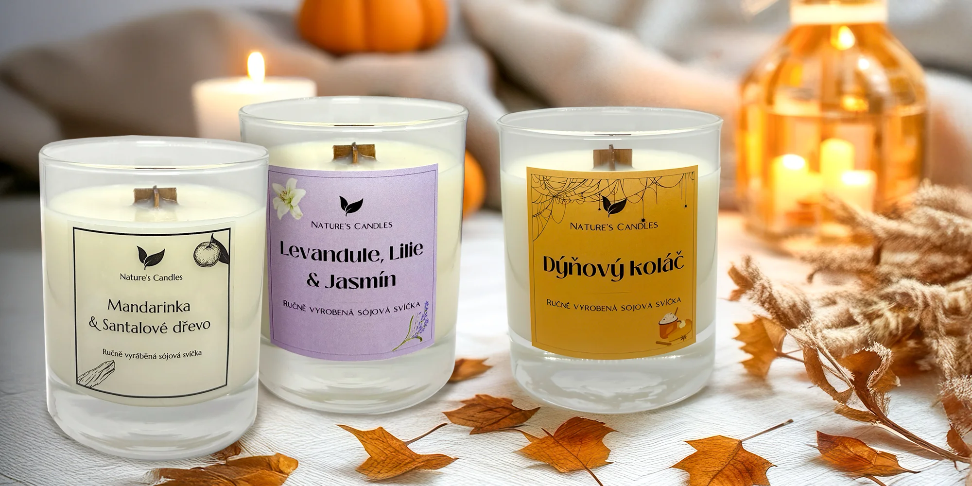 Nechte si byt provonět krásnými vůněmi. Postarají se o to vonné sójové svíčky, které ručně vyrábí Nature's Candles. Všechny svíčky jsou ekologické a přírodní: k výrobě se používá pouze 100% přírodní vosk ze sójových bobů, který neobsahuje žádné pesticidy, herbicidy ani parafín. Vosk je biologicky odbouratelný a vegan friendly. Další jeho předností je, že hoří o 50 % pomaleji něž běžné parafínové svíčky, takže vám jedna svíčka vydrží až na 50 hod. hoření. Při hoření se do ovzduší neuvolňují žádné škodliviny ani saze a nezvyšuje se množství CO² v místnosti.