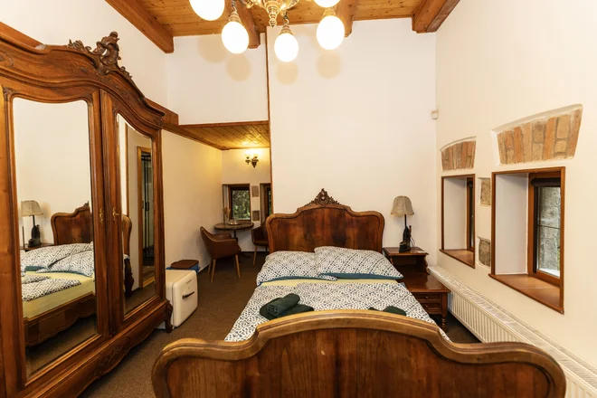 Na výběr máte dvoulůžkový nebo čtyřlůžkový pokoj, domluvit se dá také dětská postýlka. Zamluvit si můžete i romantické bydlení až úplně nahoře ve věžičce. Každý pokoj má vlastní koupelnu se sprchou (v případě věžičky je koupelna mimo pokoj, ale jen vaše) a také ledničku a set na přípravu kávy a čaje.