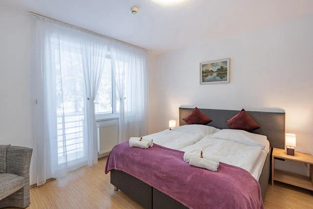 Apartmány jsou skutečně prostorné a zařízené kvalitním nábytkem, abyste se cítili pohodlně. Větší prostor navíc umožňuje ubytovat v případě potřeby větší skupinu hostů. Na výběr máte apartmán s jednou ložnicí pro 2 osoby a se dvěma možnými přistýlkami. Pro větší počet návštěvníků je zase připraven apartmán se dvěma ložnicemi, kde se pohodlně ubytuje až 6 osob.