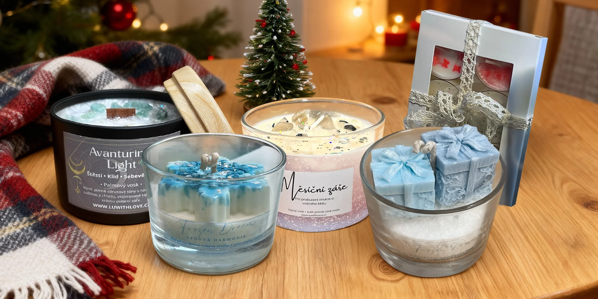 Přírodní vonné svíčky zdobené minerály, andělská křídla i vánoční baňky