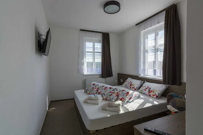 Po příjezdu pro vás bude připravený dvoulůžkový komfortní pokoj. Samozřejmostí je manželská postel, kde si necháte zdát o vašich zážitcích. Nechybí ani koupelna se sprchovým koutem a toaletou. Večery si tu zkrátíte sledováním televize či surfováním na internetu díky Wi‑Fi připojení zdarma.