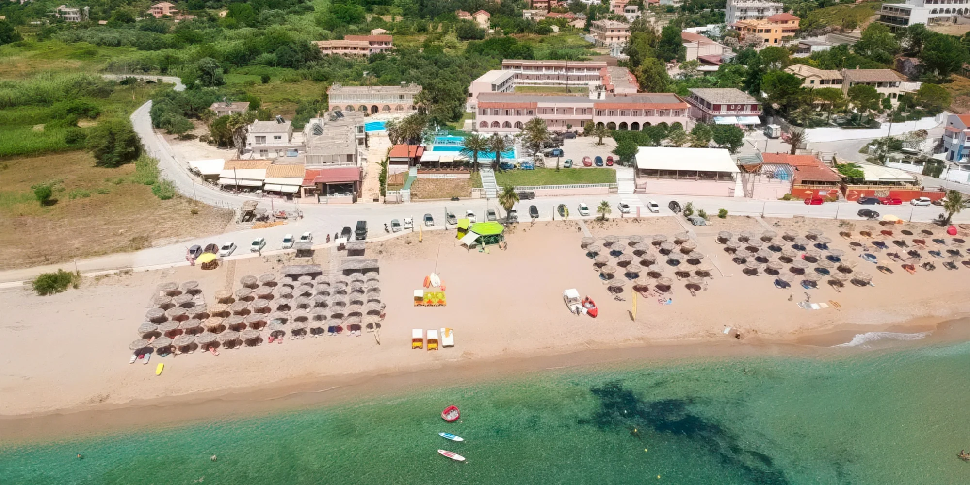 Nádherná veřejná pláž Agios Georgios se nachází jen asi 30 m od hotelu. Pláž s jemným pískempozvolným vstupem do moře je bezpečná i pro nejmenší plavce. Pokud si chcete dopřát maximální komfort, připlaťte si za slunečníky a lehátka (přibližně 15 € za set).