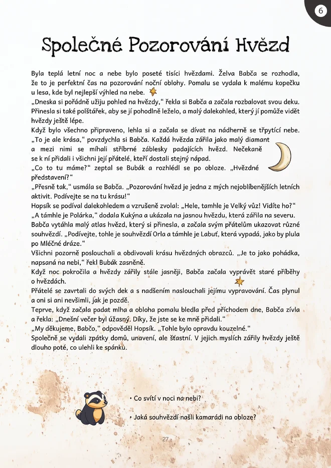 V čem tkví kouzlo těchto příběhů? Především v tom, že jde o interaktivní knížku, která nerozvíjí jen čtenářské dovednosti, ale také dětskou fantazii a logické myšlení. Jak? Každá kapitola zahrnuje nejrůznější úkoly, zajímavosti, vlastní písničku a také QR kód pro digitální doplňky. Kniha navíc obsahuje 5 listů příloh ve formě samolepek, pexesa a omalovánek – nejde tak jen o „slepé čtení“, ale o obsah, na jehož tvorbě se mohou děti aktivně podílet.