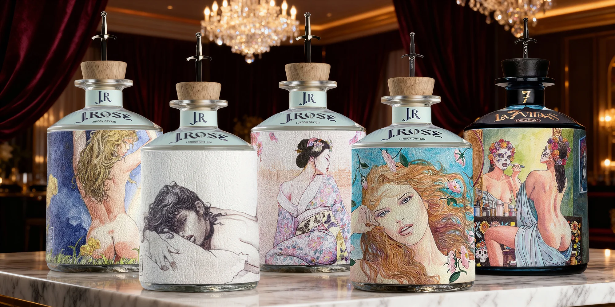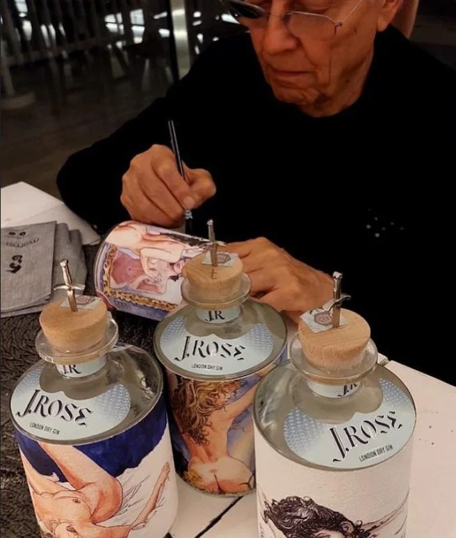 Destiláty vás neokouzlí jen chutí, ale také svými lahvemi. Ty jsou totiž prezentovány 8 unikátními vizuály, které navrhl nejznámější italský designér, ilustrátor a tvůrce komiksů Milo Manara. Vizuály jsou jedinečné a provokativní. J. Rose má duši Itálie – Manara se proto při tvorbě ručně vyráběných etiket inspiruje mistry, kteří tvořili dějiny umění, a používá směs získanou z carrarského mramoru a římského travertinu.