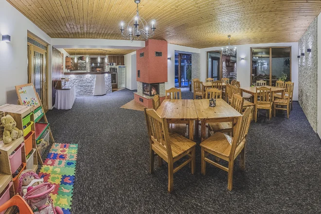 Společenská místnost s krbem poslouží k příjemnému odpočinku za doprovodu praskajícího dřeva. Resort se nachází přesně mezi dvěma aquaparky Tatralandia (8 km) a Bešeňová (12 km).