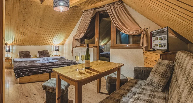 Malebné pokoje vás zaujmou už na první pohled. Potěší zejména dřevěným interiérem, který připomíná ubytování v rodinné chatě a komfortním zařízením. Je z nich cítit příjemná atmosféra a klid. Jsou orientovány buď na východ – tehdy se vám naskytne výhled na masiv Západních a Nízkých Tater –, nebo na západ, v tomto případě vás okouzlí výhled na les, zahradu a masiv Chočských vrchů.