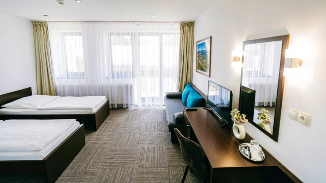Po aktivním dni si unavené tělo určitě rádi natáhnete v komfortním pokoji. Hotel nabízí několik typů ubytování pro různé potřeby a počty hostů. Dvoulůžkový pokoj Klasik (27 m²) potěší páry i menší rodiny – má tři jednolůžkové postele, které lze v případě potřeby spojit, koupelnu se sprchovým koutem a kosmetikou, TV, trezor a ledničku. Prostornější dvoulůžkový pokoj Deluxe (30–35 m²) poskytuje větší komfort díky vaně, minibaru a výhledu na bazén či tělocvičnu.