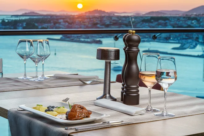 Správná dovolená si žádá odpočinek od každodenního vyvařování. Proto máte v ceně pobytu snídaně či polopenze. Obojí je podávané formou bufetu – každý den si tedy naberete na talíř, co hrdlo ráčí. Po ránu čerstvé pečivo, sýry, šunky, ovoce, zeleninu… večer zas poctivý kus masa, přílohy, saláty. Jednoduše si každý přijde na své. Hotel se navíc nejmenuje „Sky“ jen tak pro nic za nic – restaurace je umístěna v jednom z vyšších pater a díky velkým oknům poskytuje panoramatický výhled na celé pobřeží.