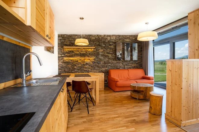 Příroda proniká i do interiérů, kde se přirozeně spojuje kombinace přírodních materiálů a zemitých barev s moderními prvky. Ke každému apartmánu náleží také venkovní terasa, kde můžete trávit příjemné společné chvíle.