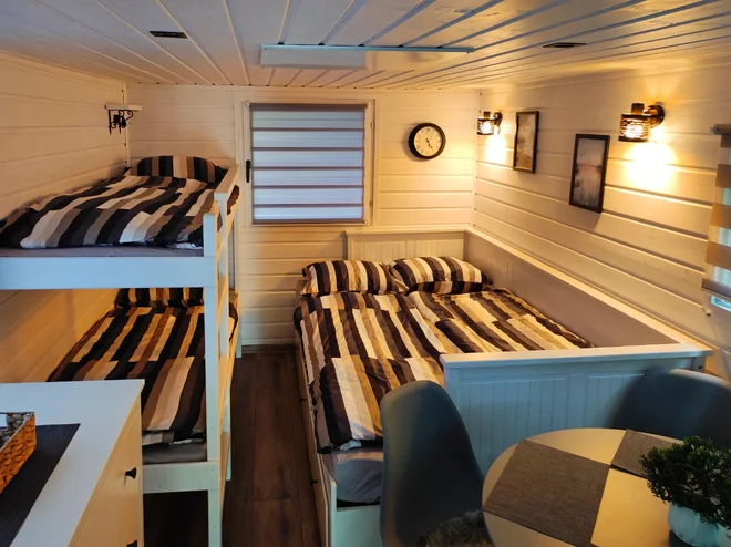 V hausbótu vám nebude chybět nic důležitého. Vyspíte se na pohodlné manželské posteli a palandě, samozřejmostí je i kuchyňka se sporákem a lednicí. Hygienu zajišťuje venkovní sprcha se zásobníkem na 50 litrů vody a suché WC.