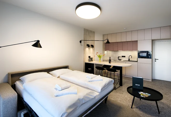 Každý apartmán disponuje ložnicí s manželskou postelí, ve které si dopřejete vydatný a ničím nerušený spánek. V ložnicích je také množství úložného prostoru. Obývací pokoj s televizí je spojen s plně zařízenou kuchyní a jídelním koutem. Dokonalým místem pro váš odpočinek a společné chvíle bude také prostorná venkovní terasa nebo balkon.