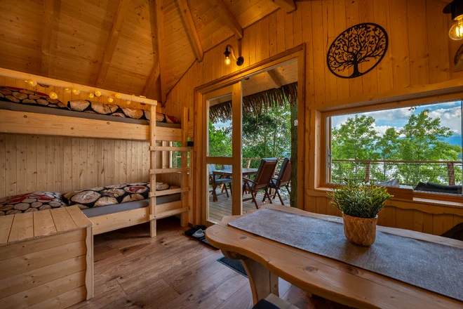 Domeček je postaven z ekologických materiálů, konkrétně ze smrkového a borovicového dřeva. Uvnitř najdete dvoulůžkovou manželskou postel a palandu se dvěma místy na spaní, což je ideální i pro rodiny s dětmi. Spát budete na prvotřídních matracích, abyste byli ráno svěží jako rybička.