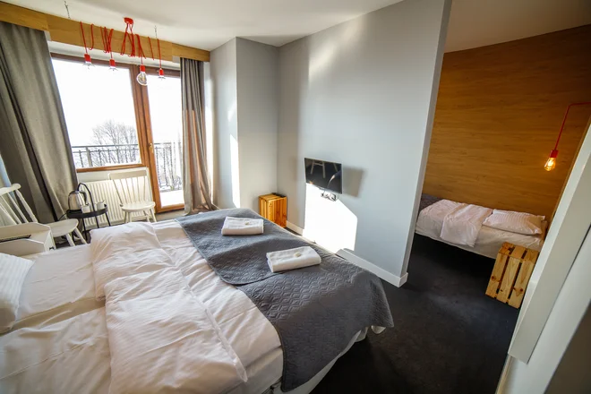 Jednolůžkové a dvoulůžkové pokoje jsou vybavené postelemi, šatní skříní a psacím stolem, studio 3+1 je skvělou volbou pro rodinu, protože se skládá ze dvou průchozích pokojů se třemi lůžky a pohovkou. Každý pokoj má televizi a balkon s výhledem na centrum města Wisła a Slezské Beskydy. Prostorné apartmány pak nabízí dvě ložnice, obývací pokoj s rozkládací pohovkou a kuchyňský kout.
