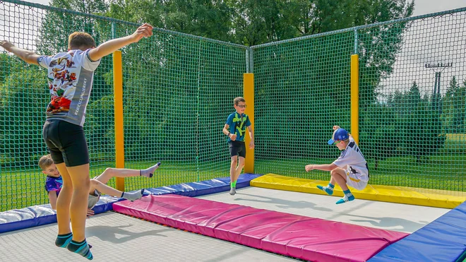 - Venkovní hřiště (prolézačky, skluzavky, houpací sítě), exteriérové profesionální trampolíny, dětská lanovka/kladka