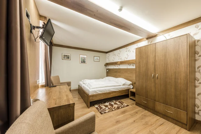 Hotelové pokoje se nacházejí v hlavní budově areálu, která se dělí na ubytovací část a sportovně-relaxační část. Ubytujete se ve dvoulůžkovém nebo třílůžkovém pokoji. K dispozici budete mít koupelnu se sprchovým koutem. Samozřejmostí je dostupné Wi‑Fi připojení. V pokojích najdete veškeré potřebné vybavení.