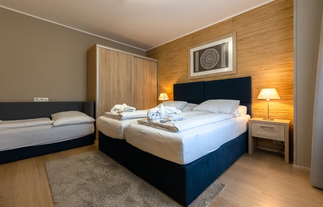 Ubytujte se ve stylově zařízeném dvojlůžkovém pokoji Standard se samostatnou koupelnou, ve které se nachází sprchový kout, toaleta i fén na vlasy, nebo v apartmánu dle svého výběru. Dvojlůžkový apartmán Basic i čtyřlůžkový apartmán Superior (se dvěma samostatnými ložnicemi) disponují obývacím prostorem s pohodlnou sedací soupravou a možností dvou přistýlek.