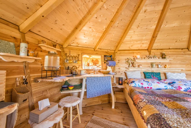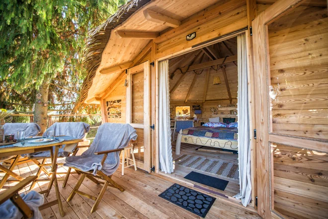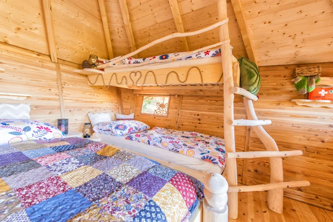 Po vstupu do domečkové oázy se před vámi rozprostře velká manželská postel a jedna patrová postel se dvěma lůžky, kuchyňský koutek se židlemi i stolem a venku strávíte příjemné chvíle v obklopení lesa na terase, kde se nachází stůl a 4 židle. Kvůli bezpečnosti je po stranách schodiště k domečku natažená síť. Klidně s sebou tedy vezměte i děti, vždyť kdo by si nechtěl splnit sen a bydlet v domečku na stromě? Bez zbytečných rozptýlení se konečně můžete pořádně věnovat sobě a své rodině. K vybavení dále patří venkovní suchá toaleta bez zápachu s ikonickým vyřezaným srdíčkem na dřevěných dveřích.