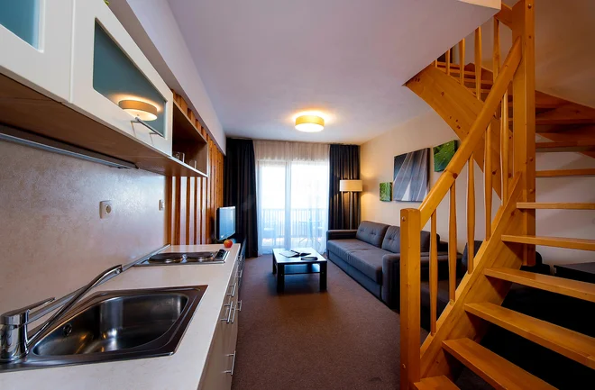 Pokud jste na dovolenou vyrazili celá rodina, doporučujeme zakoupit si pobyt v apartmánu o rozloze 47 m², který kromě 2 postelí je vybaven také rozkládací pohovkou v obýváku a kuchyňkou. Samozřejmostí je koupelna se sprchou a WC, k tomu také satelitní TV. Wi‑Fi připojení k internetu je v každém apartmánu. Zařízení disponuje jednopodlažními apartmánymezonety.