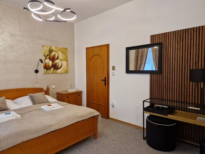 Vychutnejte si komfort a soukromí v příjemně zařízeném dvoulůžkovém pokoji s pohodlnou manželskou postelí. Pokoj disponuje vlastní koupelnou s vanou a nabízí ideální místo k relaxaci po dni plném zážitků.