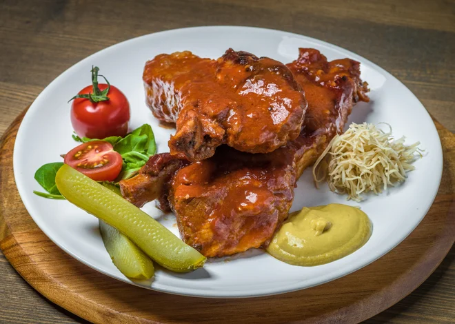 - Jestřebická vepřová BBQ žebra s hořčicí a křenem, chléb