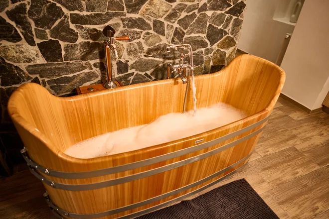 - 1× pivní lázeň v ručně vyráběné modřínové vaně s funkcí vířivky přímo v apartmánu