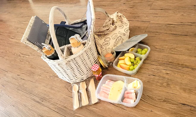 - Snídaňový piknikový koš (čaj, káva, pečivo, šunka, sýr, zelenina, vajíčka, ovoce, jogurt…) pro 2 osoby