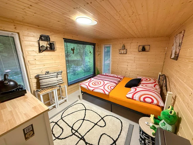 Ubytujete se v moderním a útulném dřevěném domečku, který je navržen tak, aby vám zprostředkoval maximální spojení s okolní přírodou. Díky prosklené stěně můžete přímo z pohodlí manželské postele sledovat divokou zvěř – možná zahlédnete plaché srnky či zajíce, nebo se prostě jen necháte unášet pohledem na klidnou hladinu rybníka.