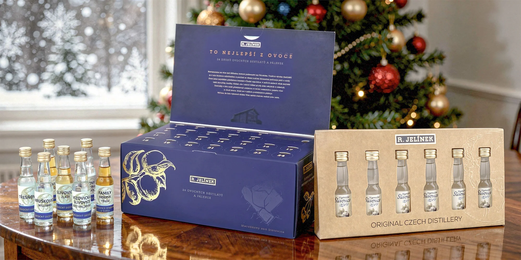 Sáhnout můžete hned po dvou sadách – menší degustační box zahrnuje šest 0,02l prémiových slivovic. Součástí adventního kalendáře je 24 lahvinek nejrůznějších pálenek z třešní, švestek, hrušek i meruněk. K tomu sada obsahuje skleničku a degustační poznámkový blok, abyste si mohli sami zhodnotit, který vzorek byl tím nejlepším.