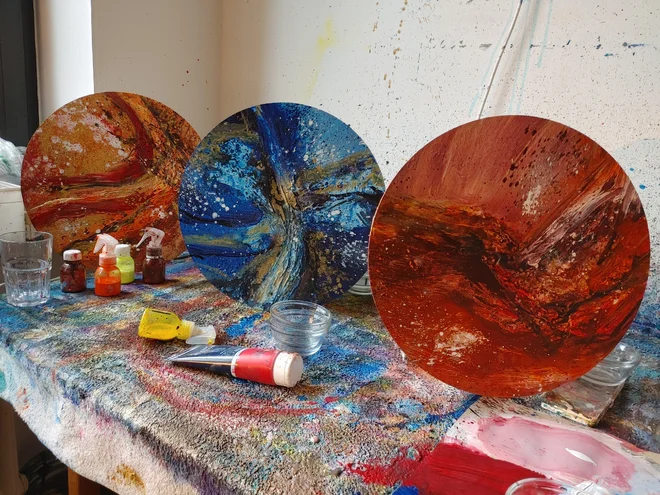 • Abstrakce, malování akrylovými barvami, inkoustem, swiping (roztírání barev pomocí špachtle), třpytivé pigmenty a další