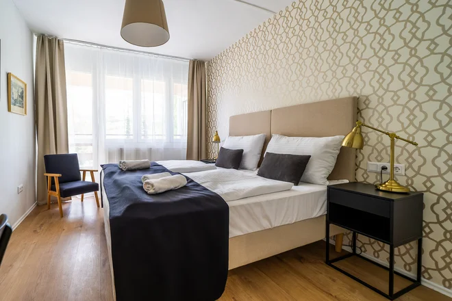 Zatímco v pokojích Classic můžete počítat s novými postelemi, v pokojích Superior vyměnili nejen ty, ale také vchodové dveře, sprchový kout a nábytek. Ať si vyberete pokoj nebo apartmán, ke všem náleží balkon, koupelna, televize a lednička. Ve třípatrovém hotelu je k dispozici také výtah a bezplatné Wi‑Fi připojení k internetu.