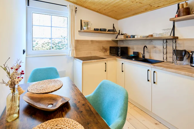 K dispozici budete mít také kuchyň, ve které vám k přípravě vašich oblíbených dobrot nebude nic chybět. Najdete zde nádobí, indukční desku i spotřebiče, jako je např. mikrovlnná trouba, rychlovarná konvice, topinkovač a kávovar. Součástí chaty je také koupelna s WC a sprchovým koutem.