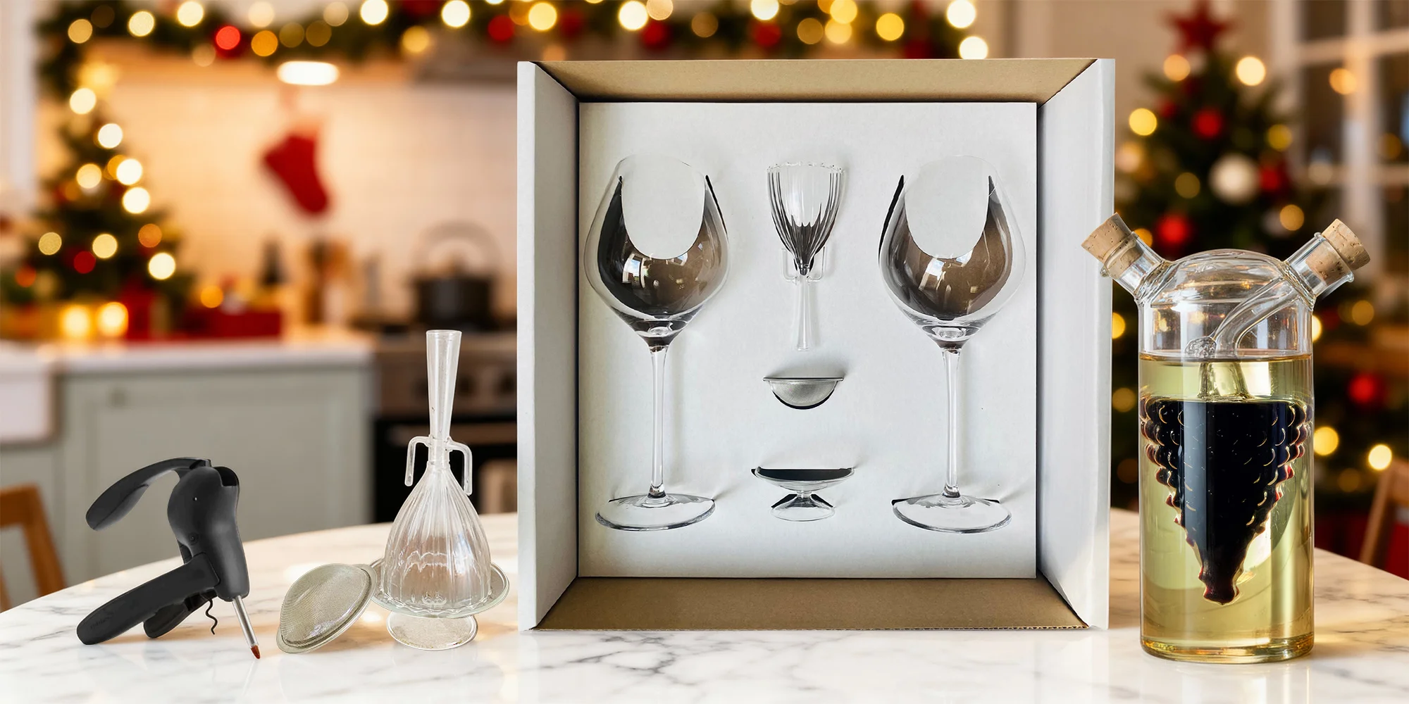 Skutečným klenotem pro vinné nadšence je dekantér Oxivin od českých sklářů. Je ručně foukaný v České republice a jeho speciální tvar okamžitě zvýrazňuje aroma a chuť vína, aniž byste museli čekat, než se víno rozdýchá. Je dodáván se skleněným podstavcem a nerezovým sítkem pro dokonalé servírování. V nabídce je také dárková kazeta s otvírákem na víno, jehož konstrukce vám umožní otevřít láhev během několika vteřin. Nechybí ani nožík pro odstranění ochranného plastu z hrdla lahve.