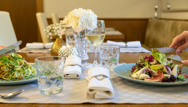 K večeři se v hotelové restauraci podává dvouchodové menu (buď hlavní jídlo s polévkou, nebo s dezertem), které si můžete nechat připravit i ve vegetariánské variantě.