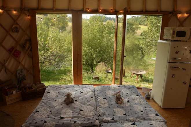 Stylové jurty na statku vám nabídnou netradiční a přitom komfortní ubytování. K dispozici je jedna manželská a jedna samostatná postel. V jurtě funguje elektřina, najdete v ní i novou retro ledničku, mikrovlnku, toustovač a rychlovarnou konvici, dokonce se připojíte na přenosnou Wi‑Fi. Jídlo tak bude ve vaší režii, ovšem vychutnáte si k němu také nádherný výhled do zeleně.