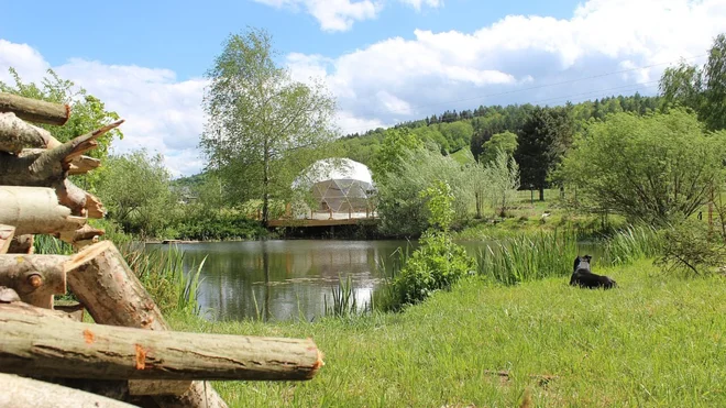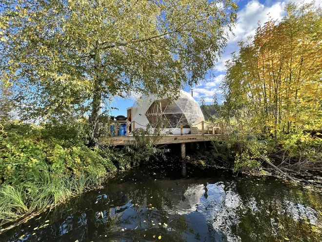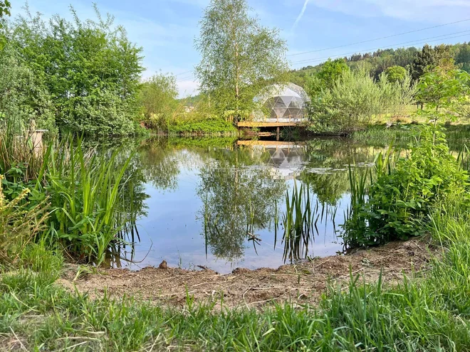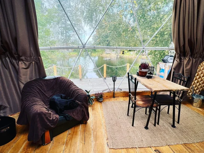 Interiér geodómu je tvořen otevřeným a vzdušným obývacím prostorem s kuchyňským koutem, kterému vévodí čelní panoramatické okno s výhledem na rybník. Koupelna se sprchovým koutem, teplou vodou, toaletou a umyvadlem jsou oddělené. Snad vůbec nejlepší na tom všem jsou ale dvě velké manželské postele – z té v přízemí uvidíte krásně na vodní hladinu, z patra budete zase pozorovat noční oblohu.