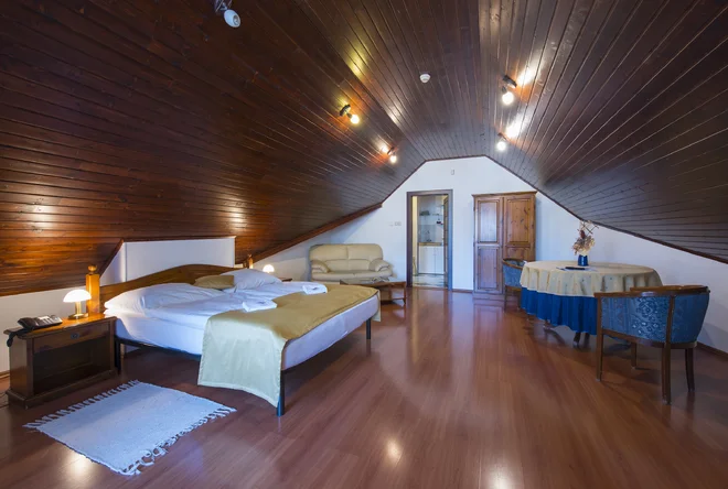 Ubytujete se v pohodlných dvou-, tří-, čtyř- a pětilůžkových pokojích. K dispozici budete mít minibar, trezor na úschovu věcí, telefon, satelitní TV i bezplatné připojení k síti Wi‑Fi. Na vyžádání je dostupná také dětská postýlka (za příplatek). Nechybí ani samostatná koupelna s toaletou. Budova hotelu je přizpůsobena i pro imobilní hosty, najdete zde jeden bezbariérový pokoj. K dispozici je také apartmán se samostatným vchodem a prostorný rodinný apartmán King, ve kterém se pohodlně vyspí až 6 osob.