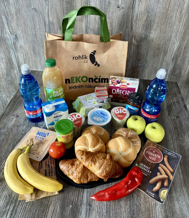 - Nápoje: Ovocný fresh / džus (1 litr), mléko (0,5 l), voda neperlivá (2 ks)